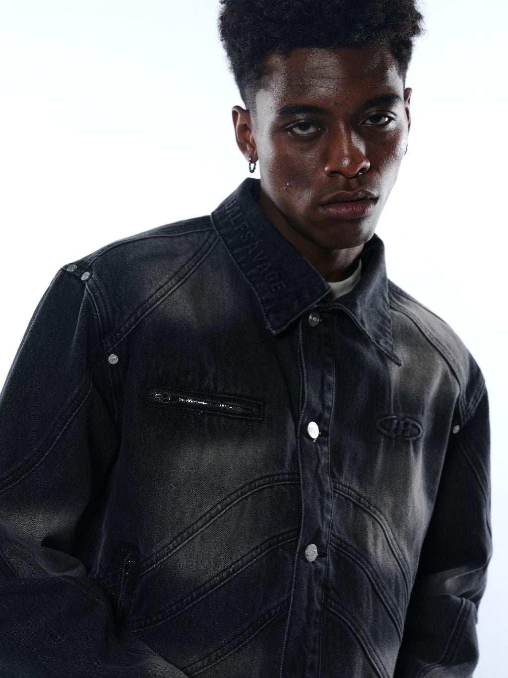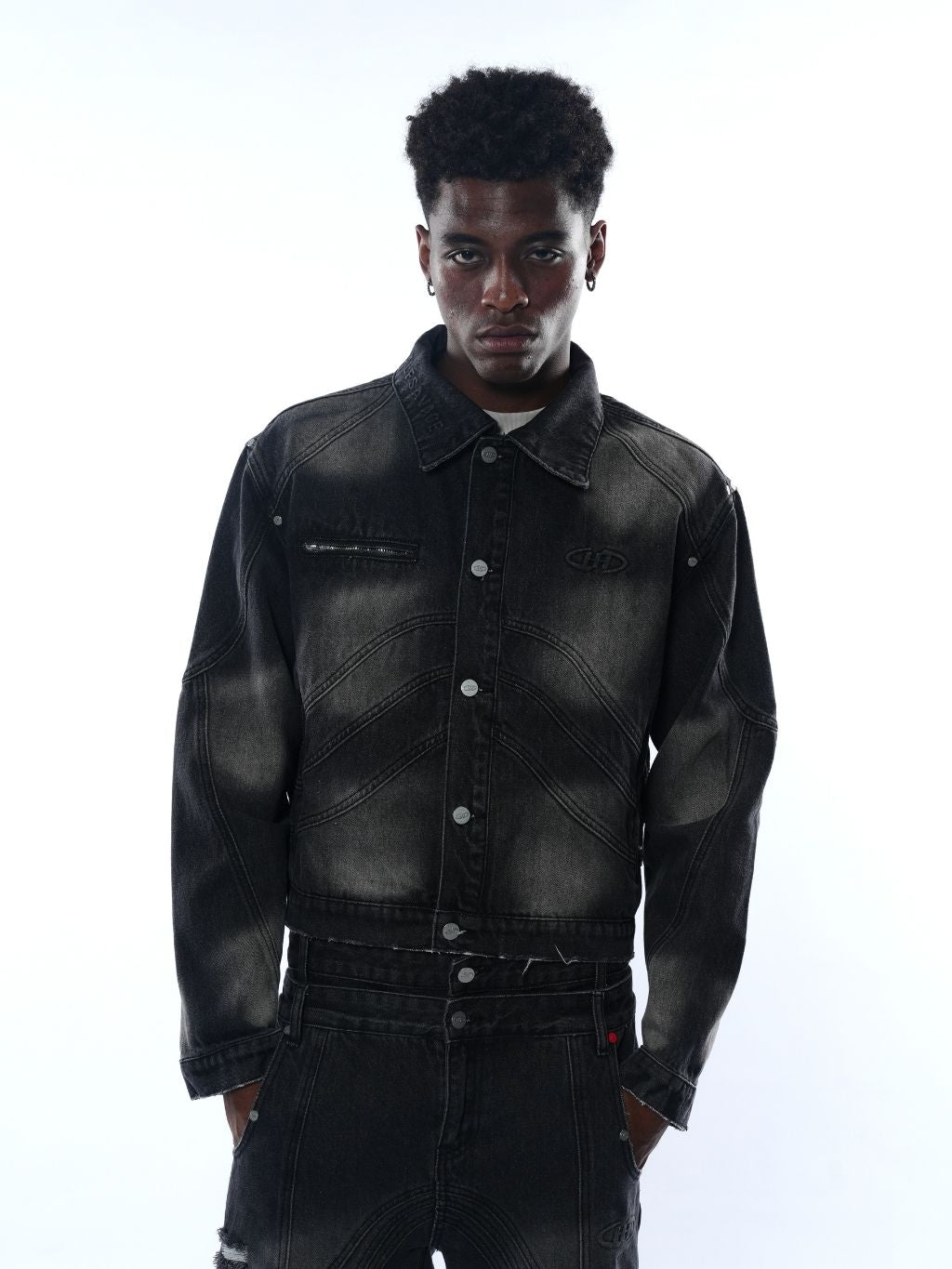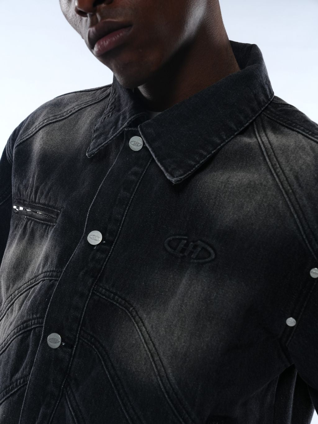 A structured denim jacket crafted from premium 15oz Japanese denim with intricate panel construction and a custom heavy wash for a distinct dimensional effect.