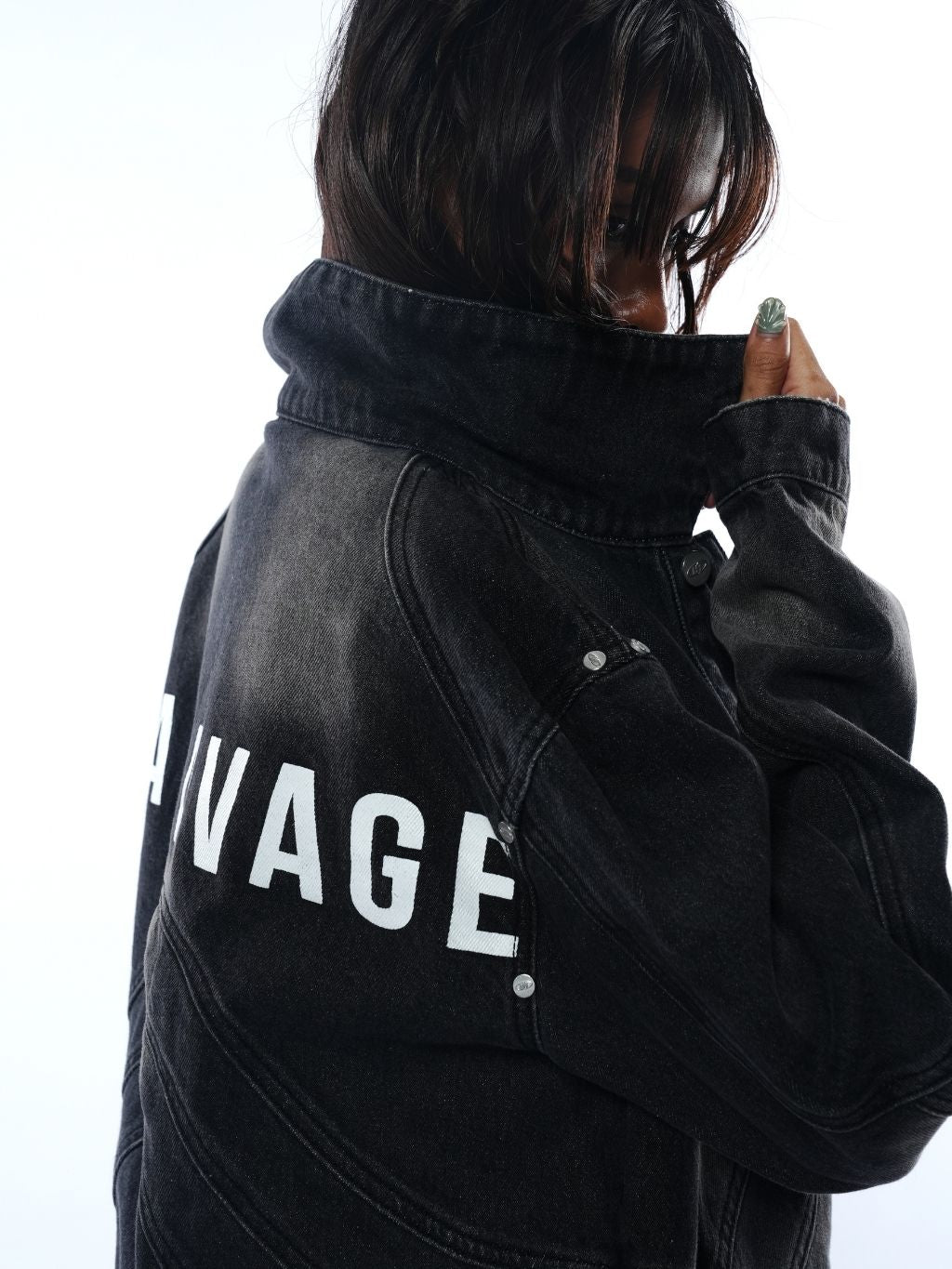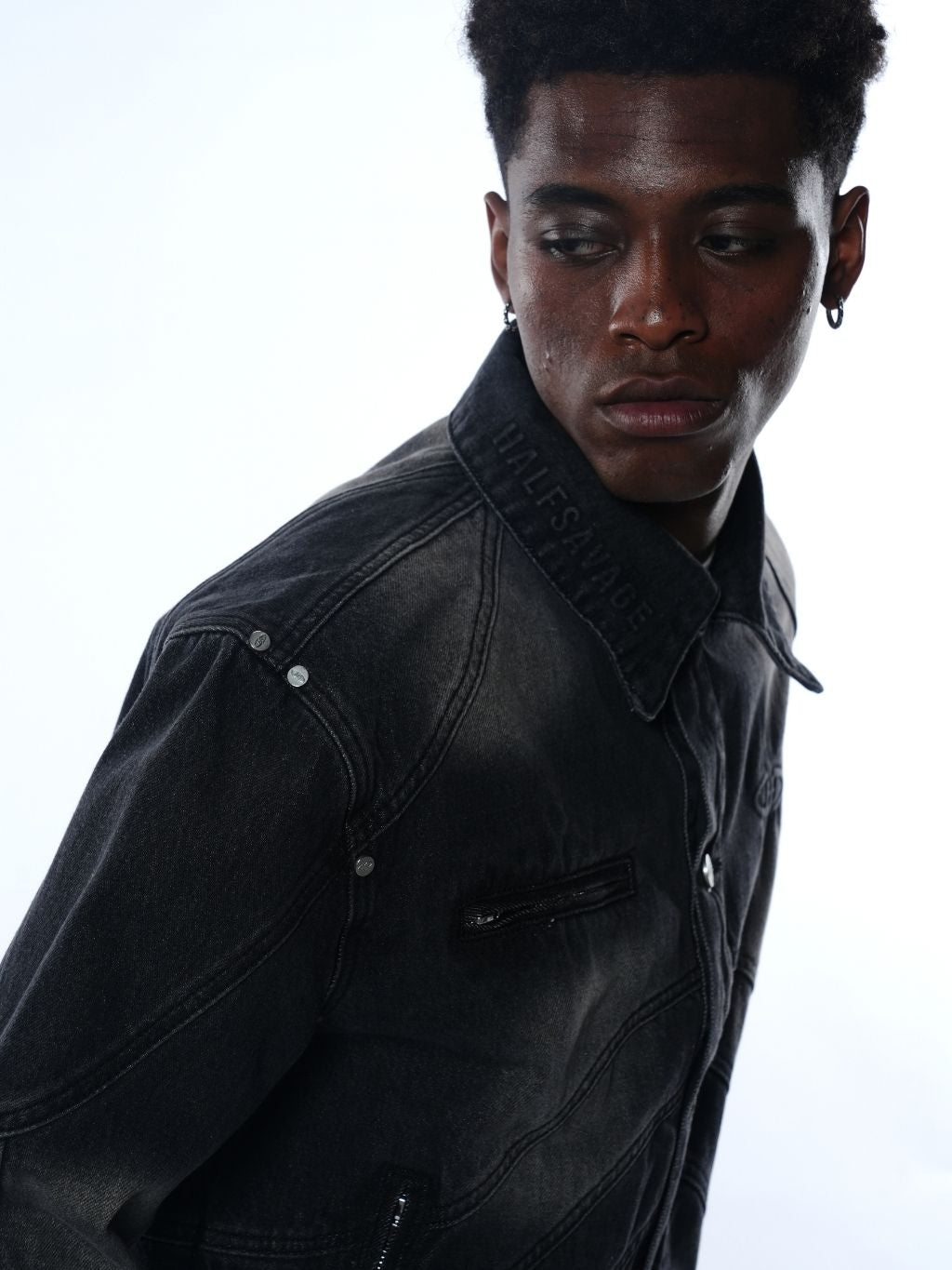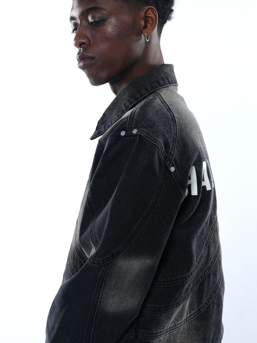 A structured denim jacket crafted from premium 15oz Japanese denim with intricate panel construction and a custom heavy wash for a distinct dimensional effect.