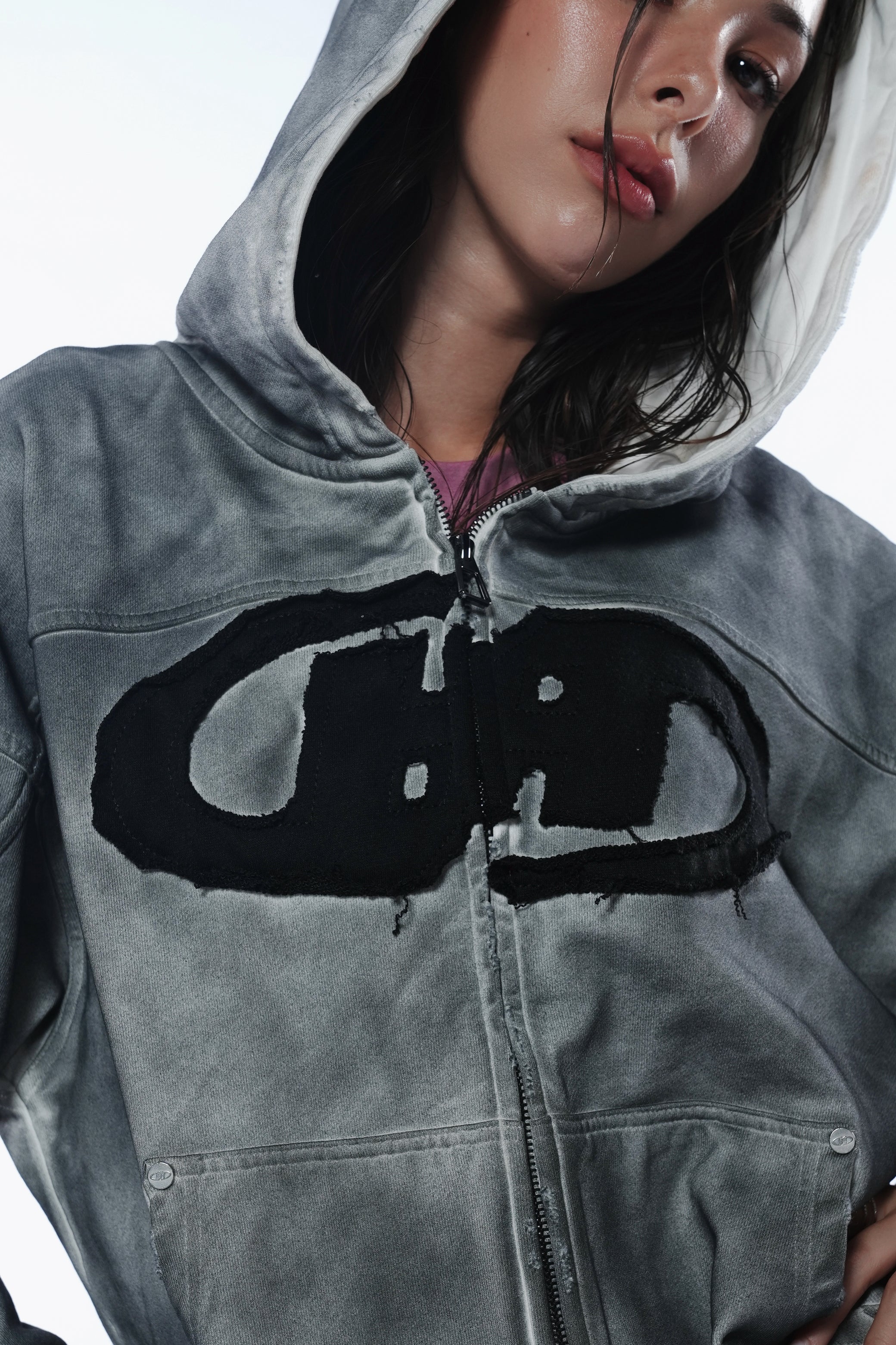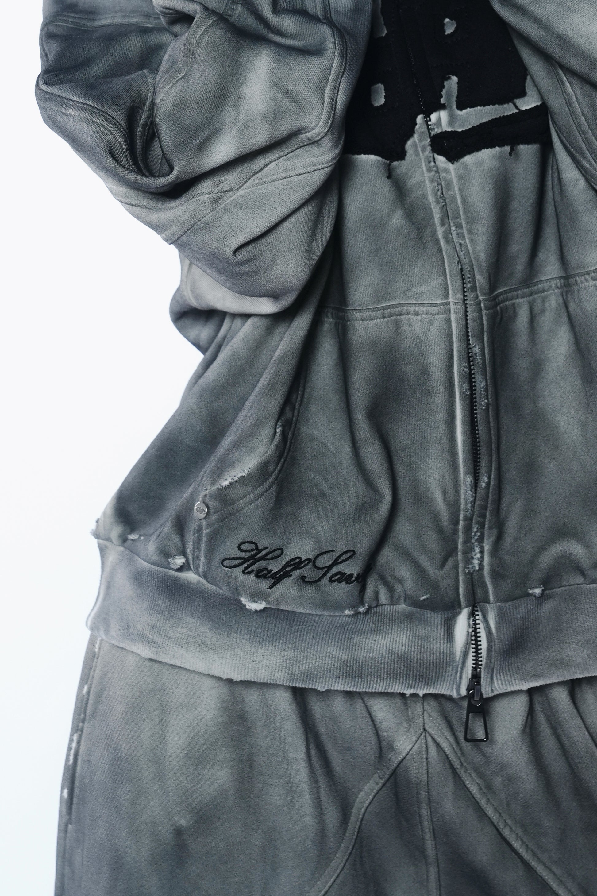 Constructed from heavyweight French terry with a washed, distressed grey finish that creates depth and character.