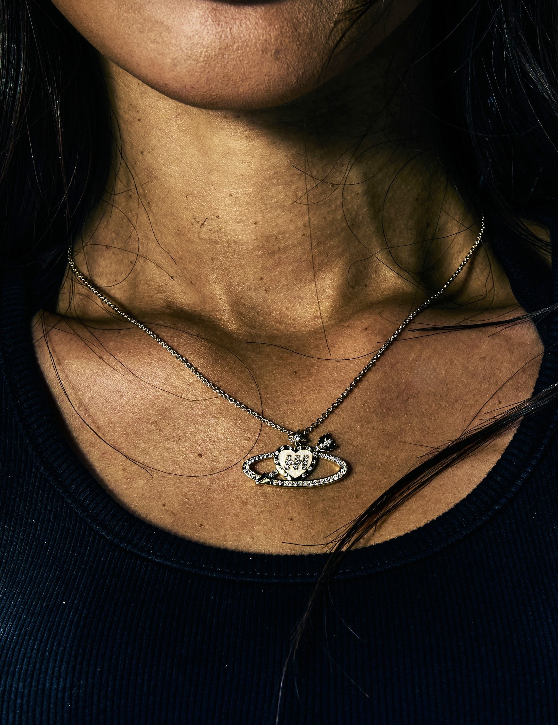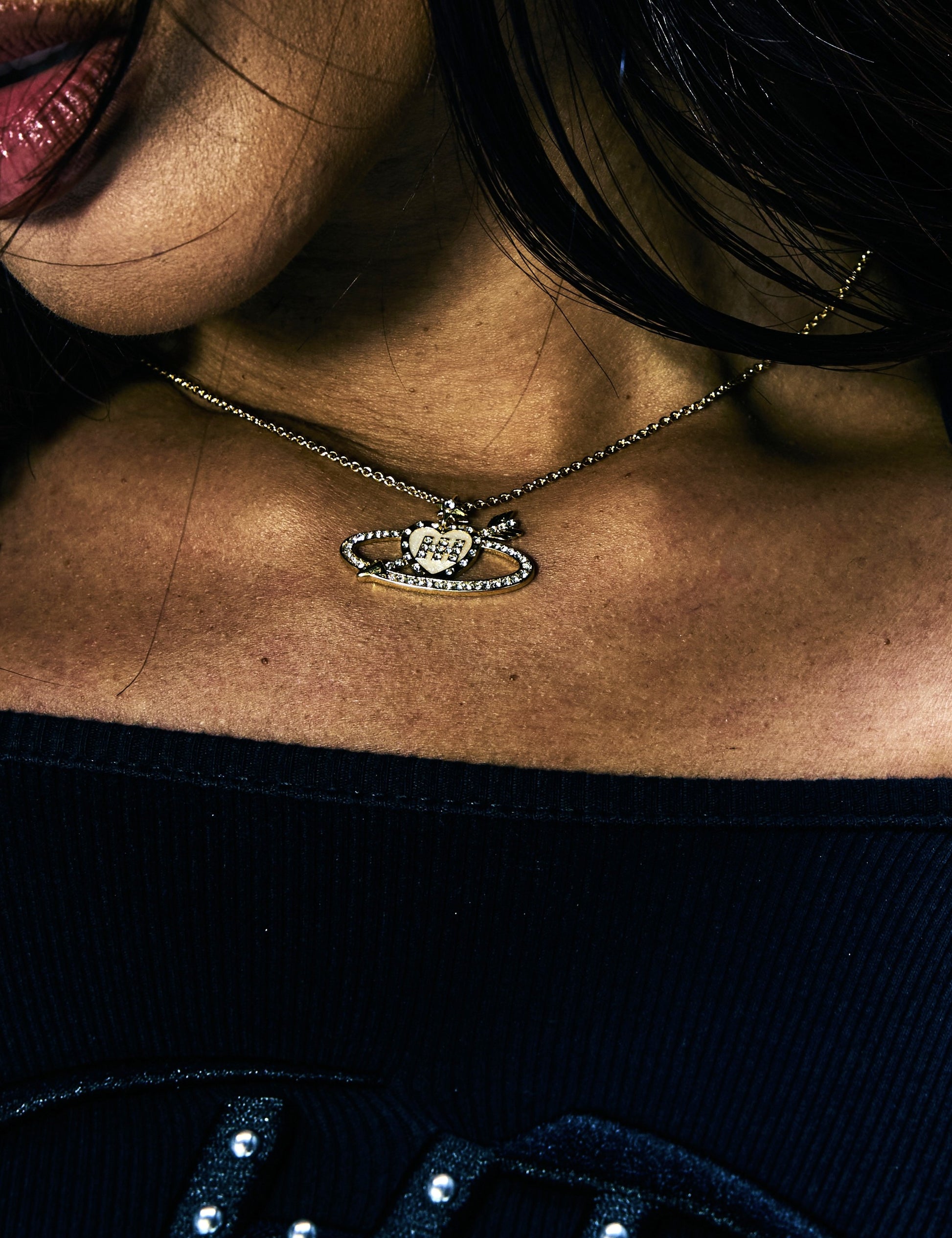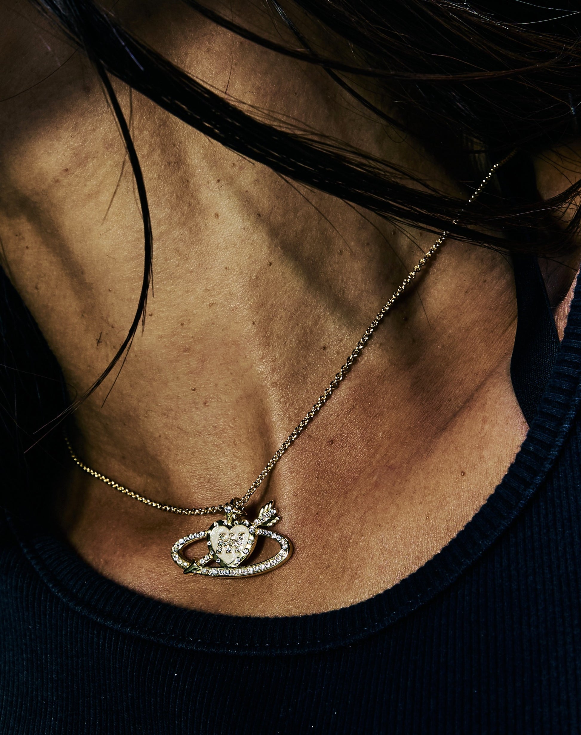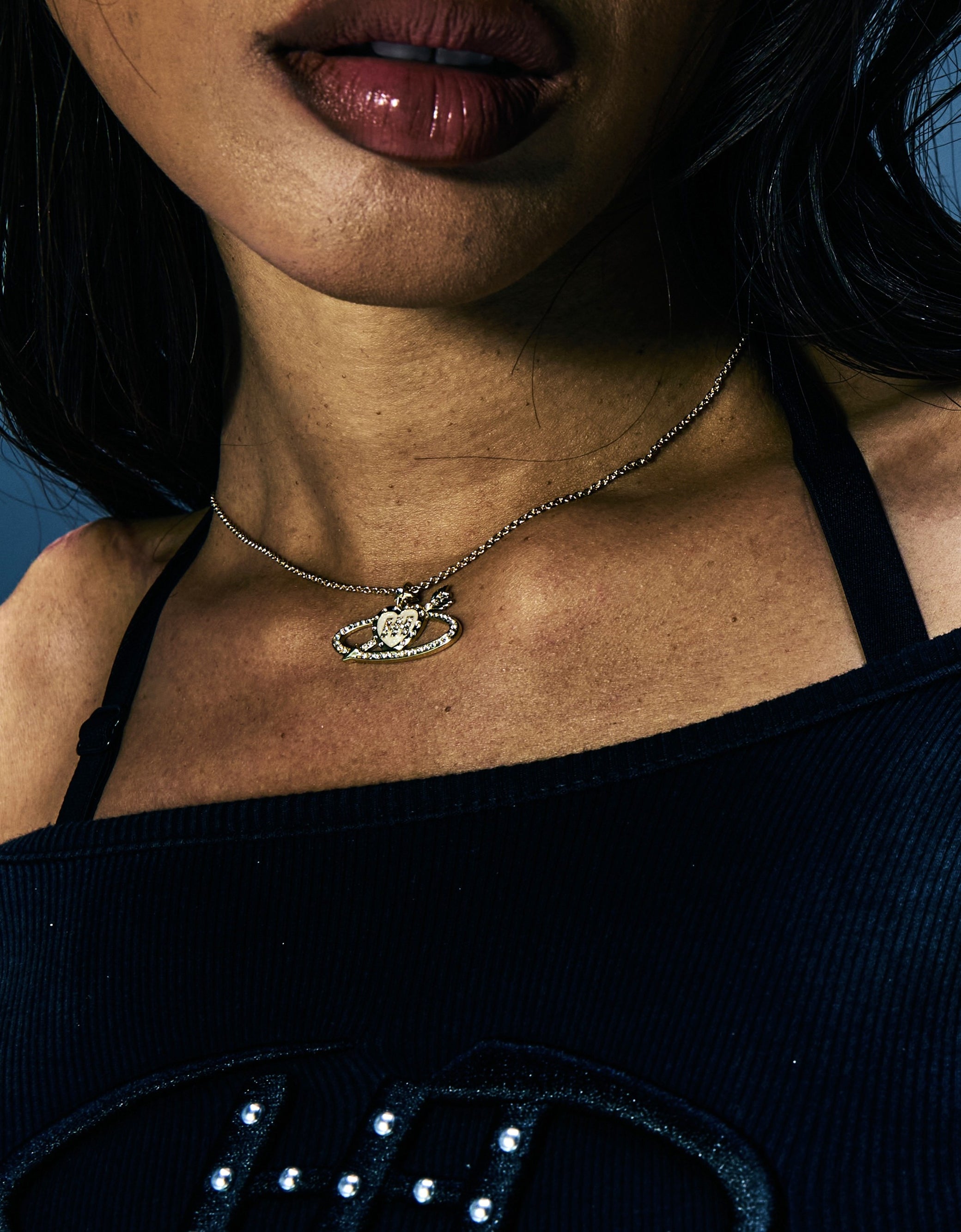 Crafted in gold-plated brass with a heart-shaped enamel center, set with rhinestones and framed in the signature orbit form.